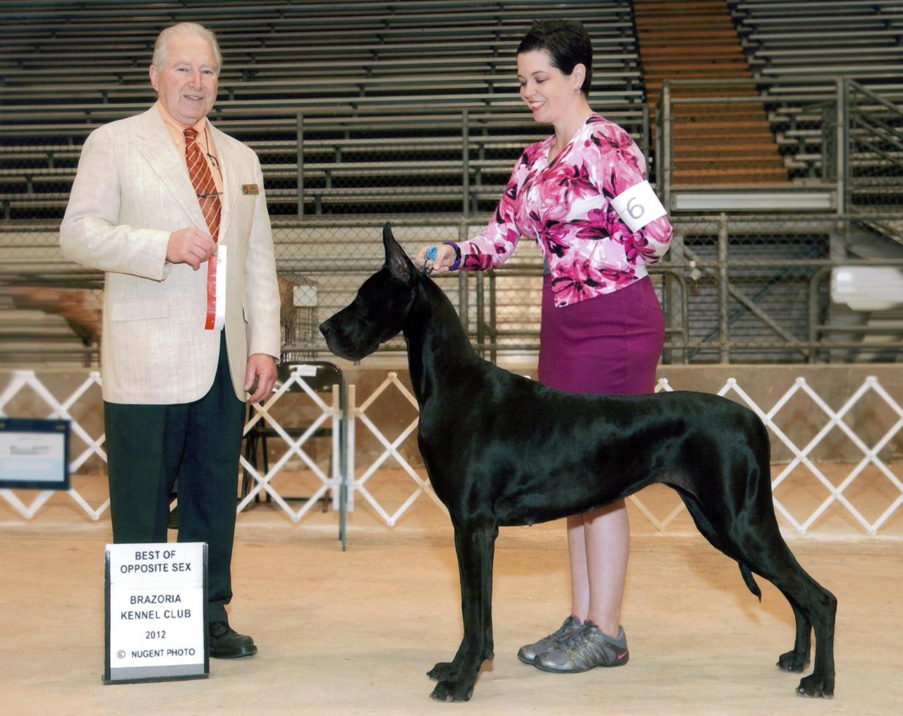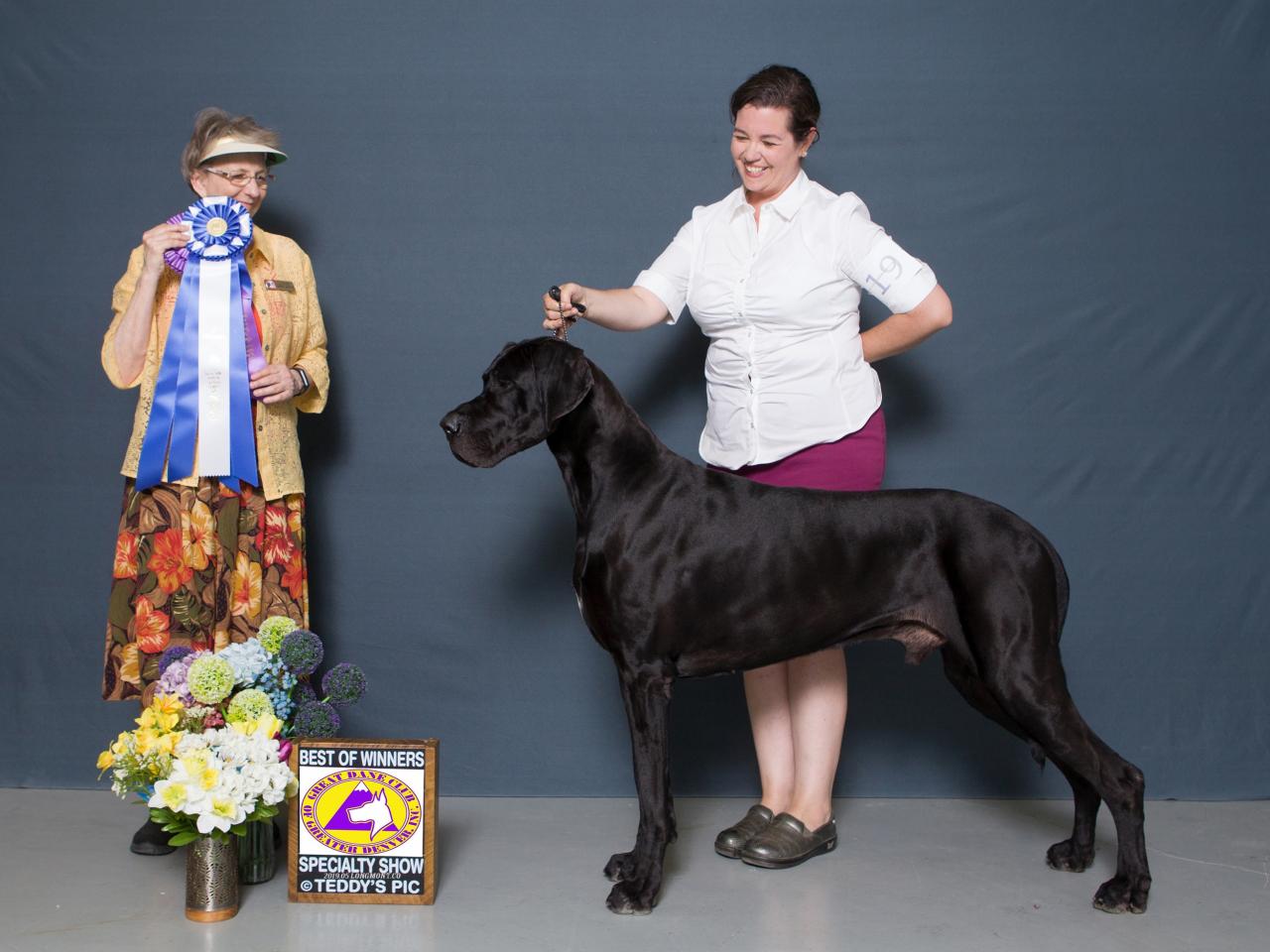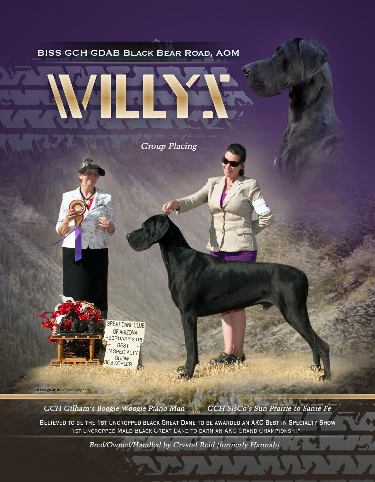 Willys is now a retired multiple group placing, Best In Specialty Show winning, grand champion. He was the first uncropped black Great Dane to earn group placements and the BISS, and the first male uncropped black Great Dane grand champion.